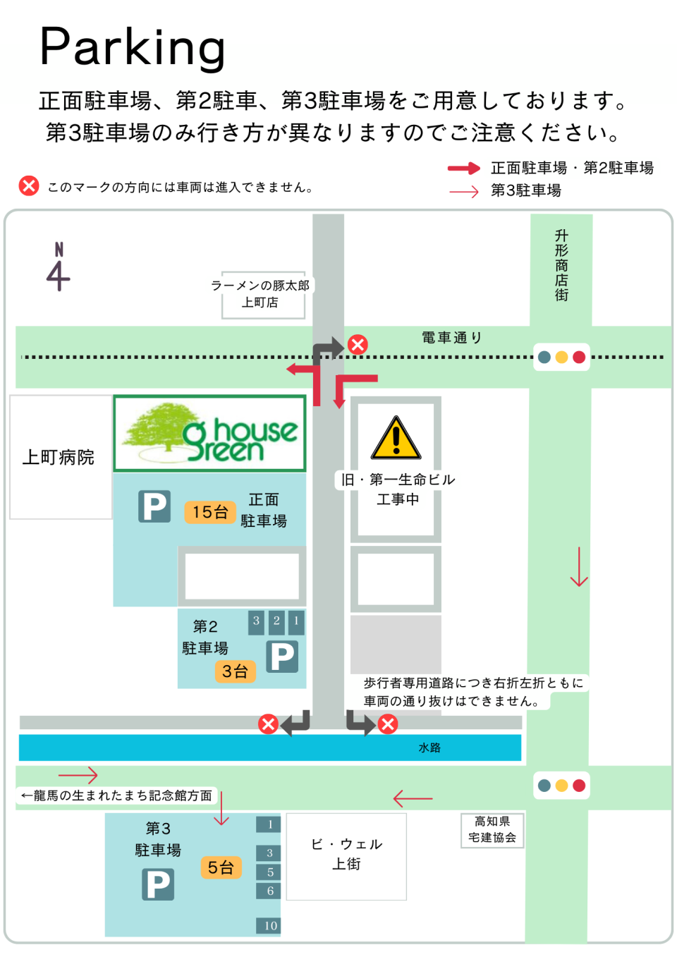 電車通りを西(いの方面)よりおいでになる際、右折は禁止となっておりますのでご注意ください。